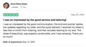 The entire process from selection to delivery was seamless. The dress arrived on time, and it fit ALMOST PERFECTLY! However, most wedding dresses need to be altered to fit each individual's unique body shape and type. It needed only minor adjustments. The quality of the fabric and the craftsmanship exceeded my expectations, making me feel like a bride without the burden of an overwhelming expense.